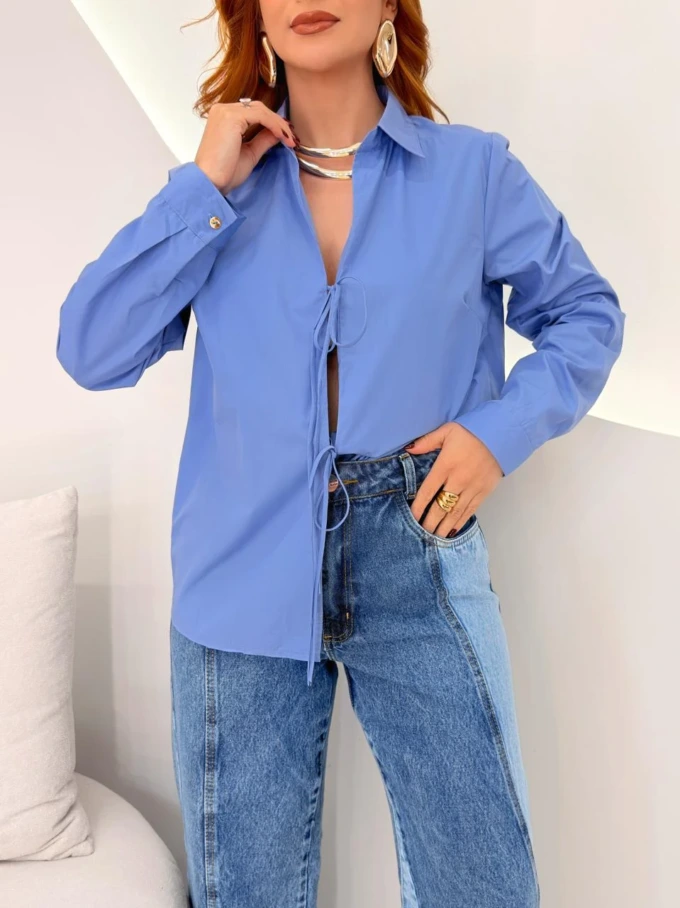 O destaque fica no decote com amarração frontal, que valoriza o colo e permite ajustar da forma que preferir. A gola e as mangas longas completam a peça trazendo um ar mais refinado