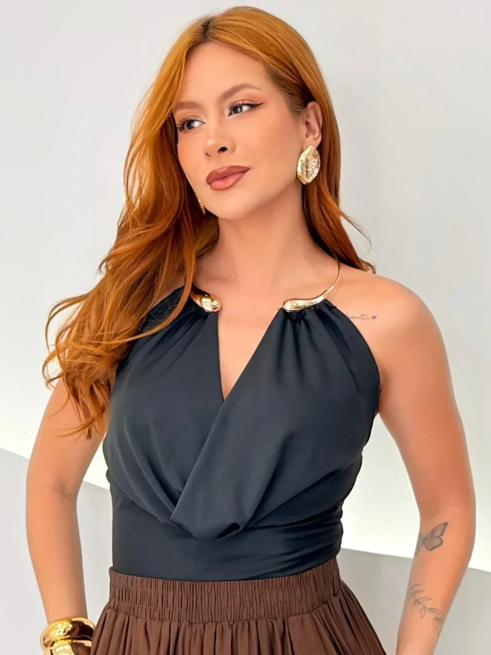 O Body Úrsula é uma peça sofisticada e moderna que valoriza o colo com seu design elegante e caimento impecável. O detalhe frontal cria um efeito drapeado super charmoso, deixando o look ainda mais estiloso.