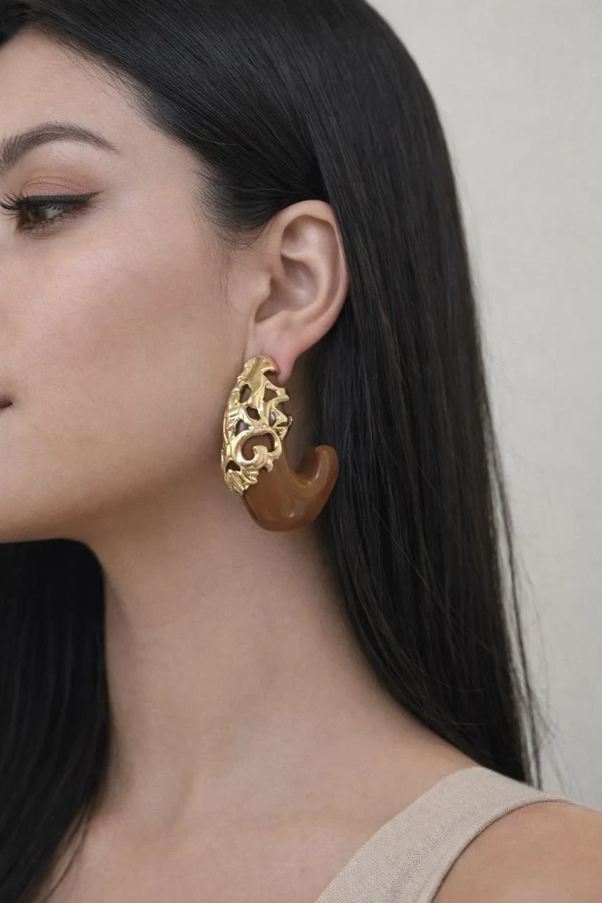 Brinco com design moderno que combina metal dourado trabalhado com detalhe em resina, criando um visual sofisticado e cheio de personalidade. Uma peça marcante, perfeita para destacar o look com elegância.
