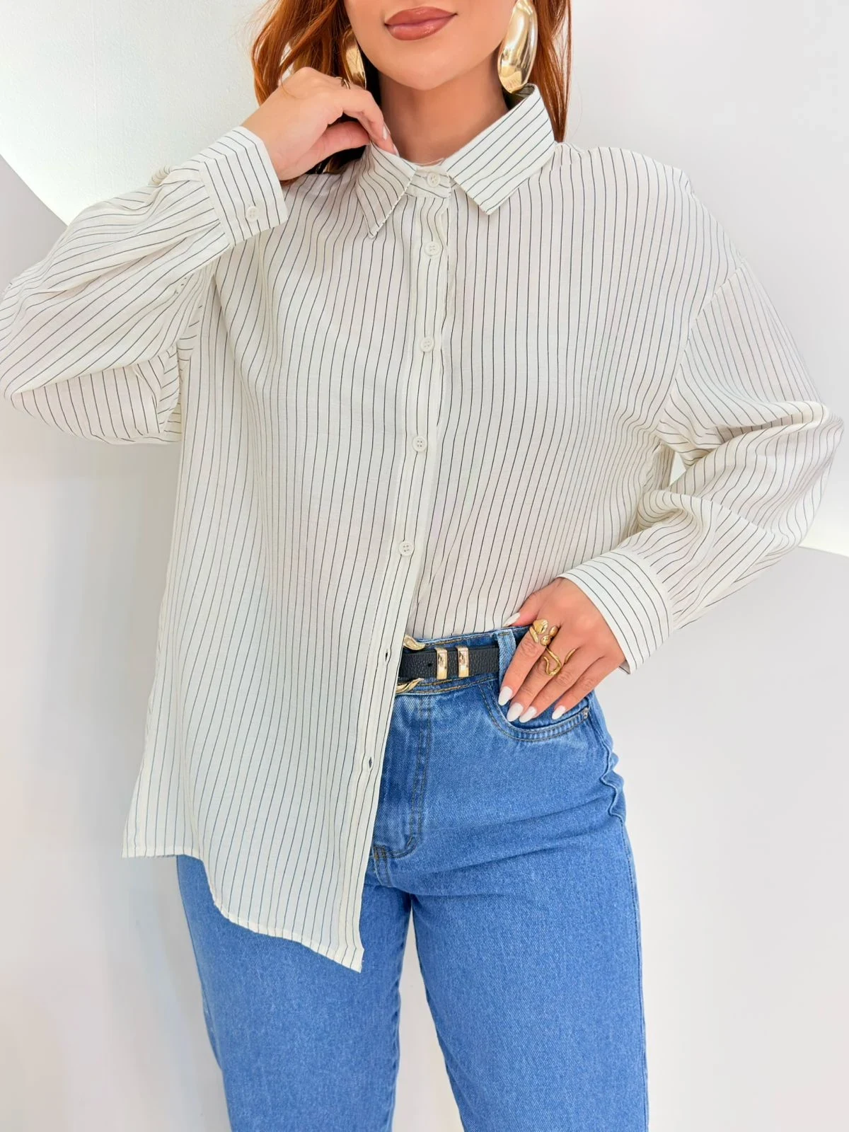 Modelo com caimento soltinho, botões frontais e mangas confortáveis.