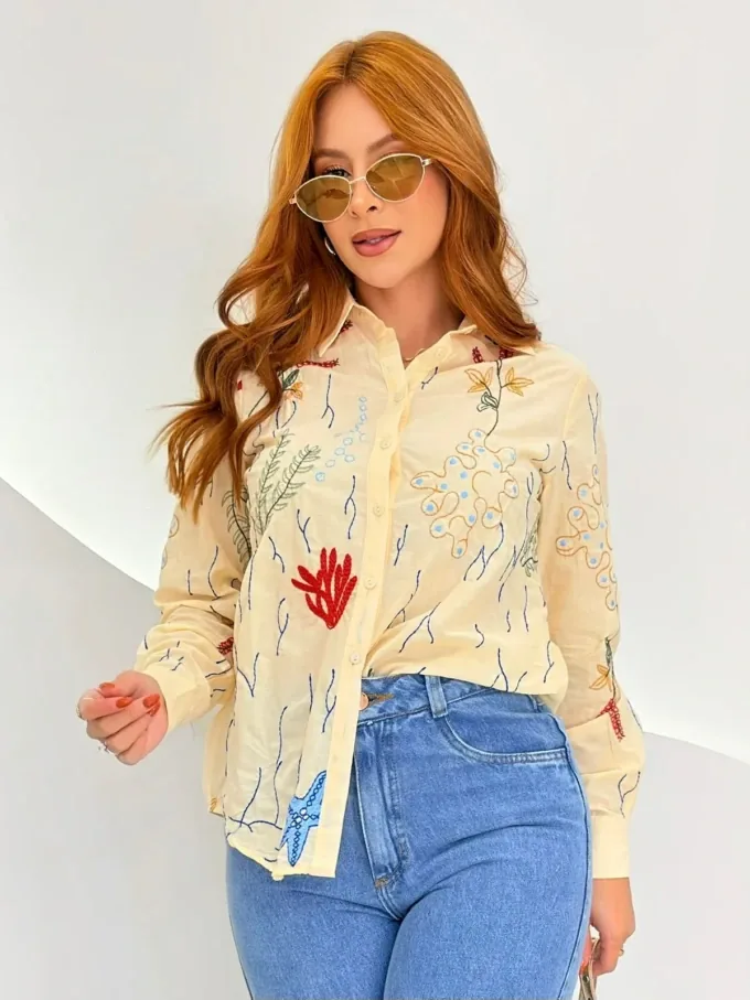 Camisa feminina com bordados delicados inspirados na vida marinha. Modelagem confortável, manga longa e fechamento frontal por botões.