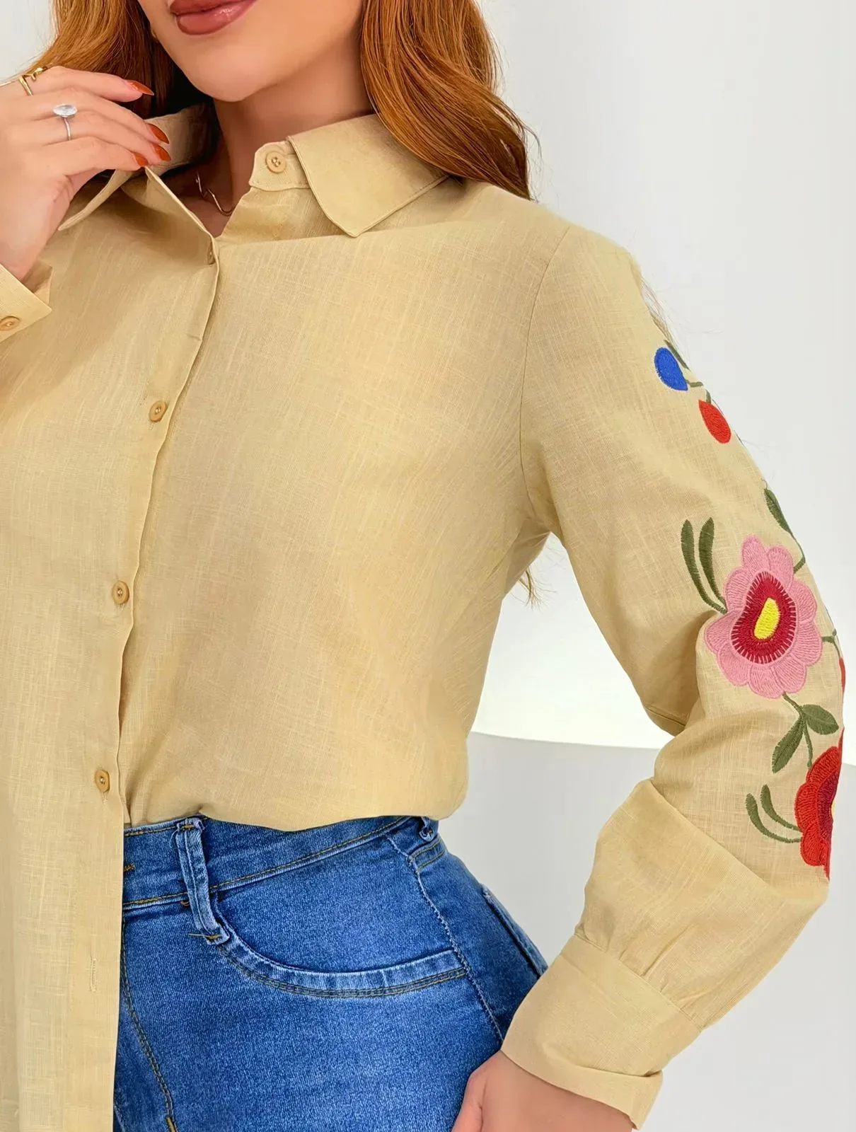 O charme fica por conta dos bordados florais nas mangas, que deixam a peça delicada e sofisticada na medida certa.