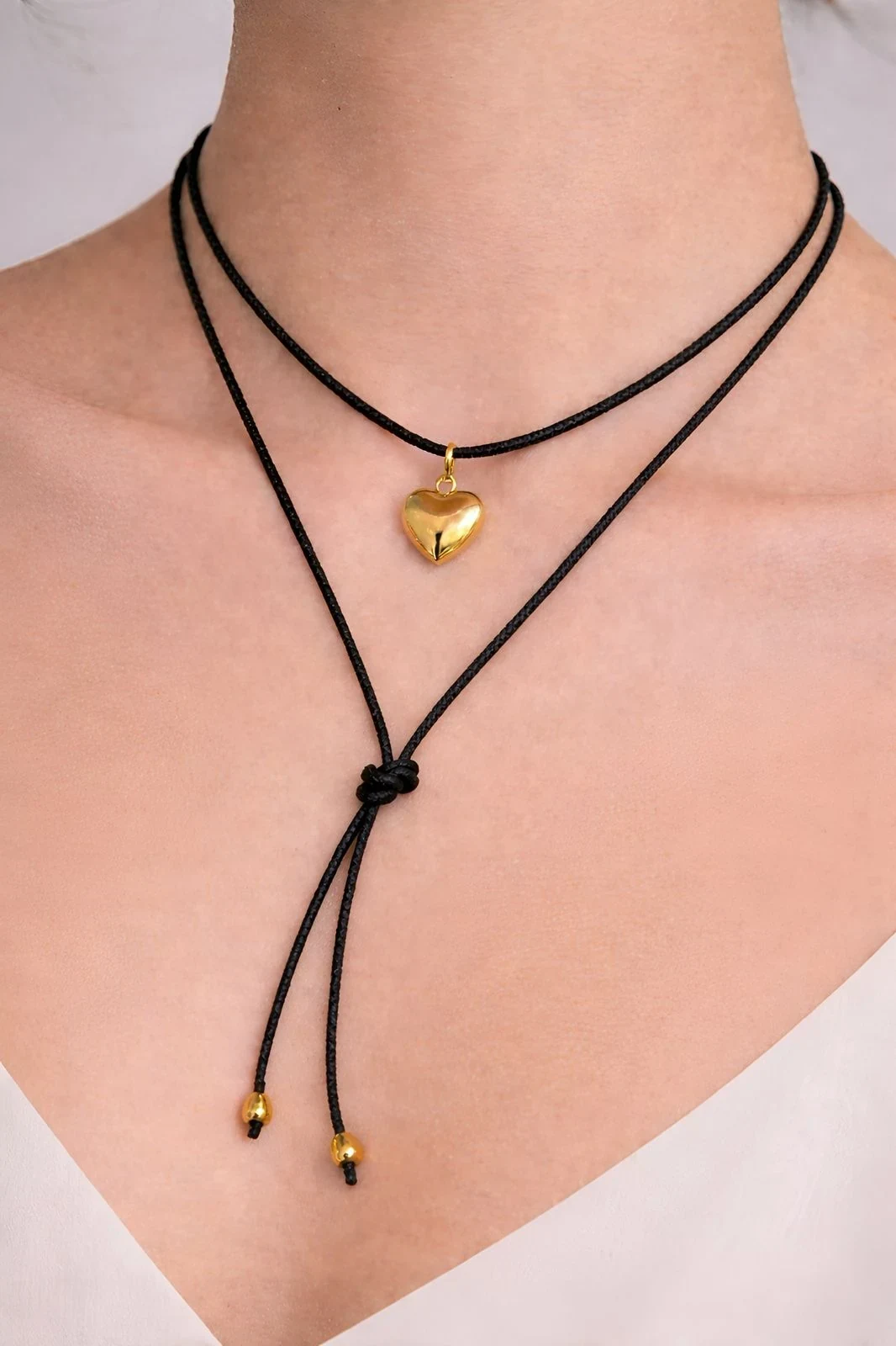 Colar delicado com pingente de coração dourado e cordão ajustável. Uma peça moderna e versátil, perfeita para usar no dia a dia e complementar qualquer look com um toque de charme.