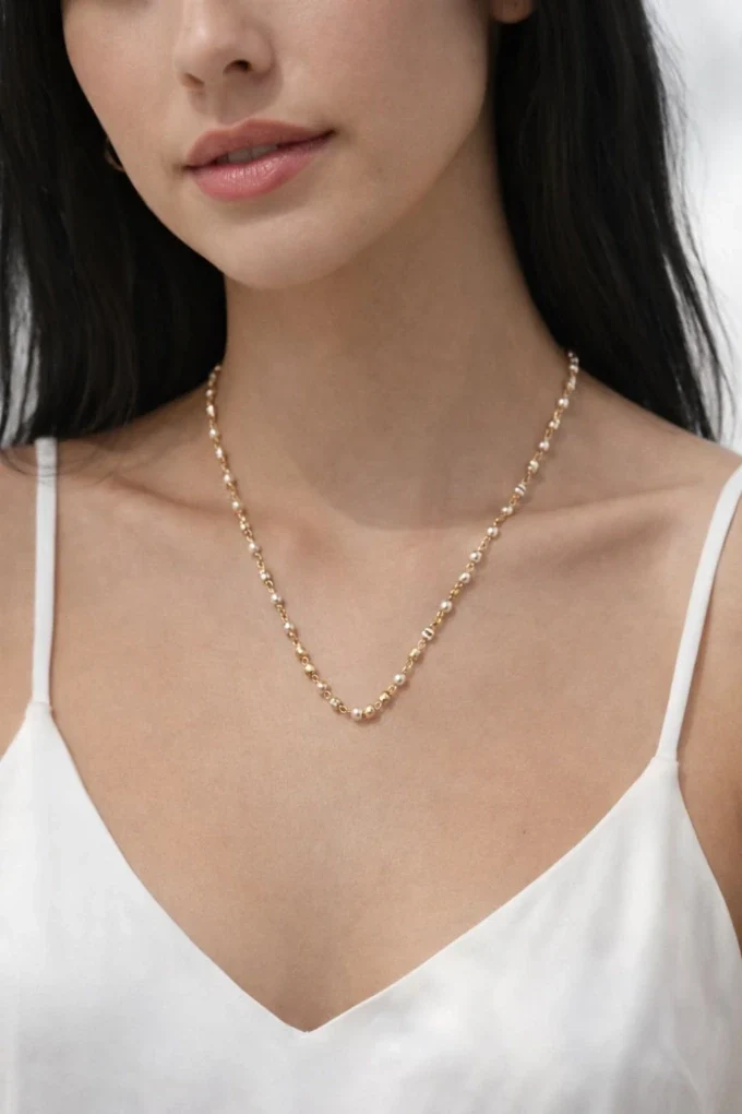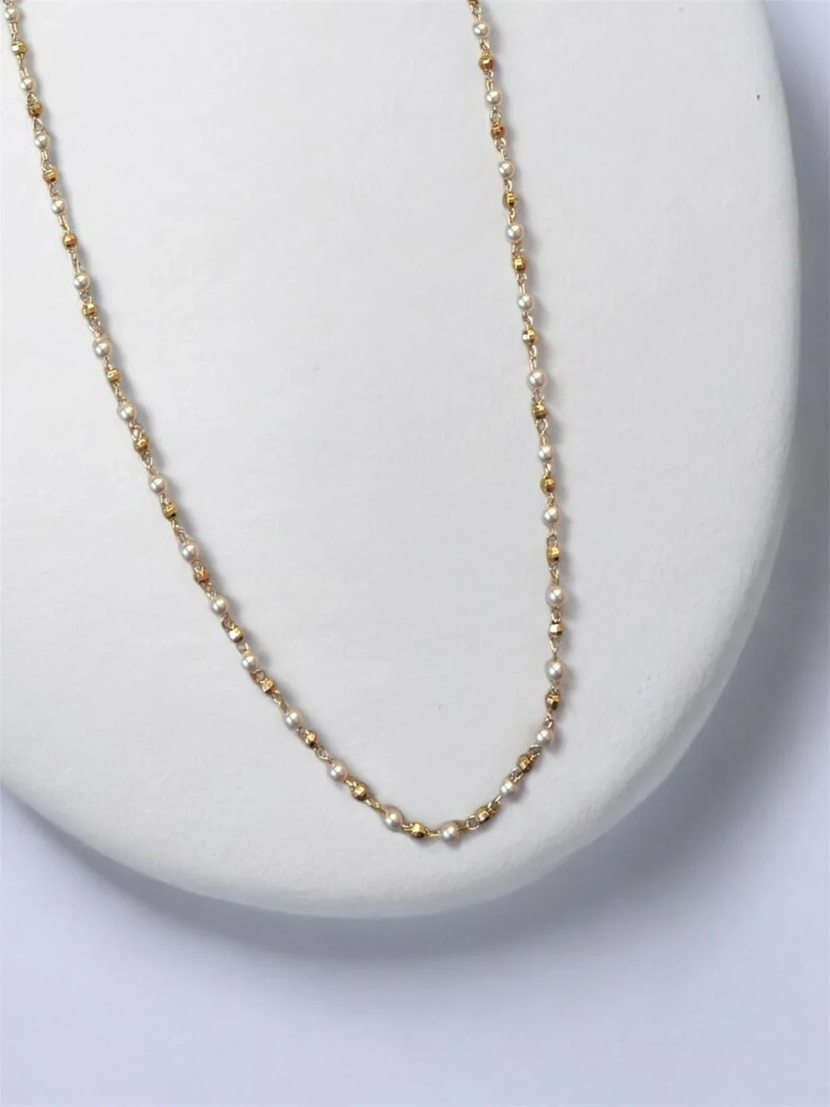 Colar delicado com corrente dourada e pequenas pérolas intercaladas, criando um visual elegante e minimalista. Uma peça versátil, perfeita para usar sozinha ou combinar com outros colares.