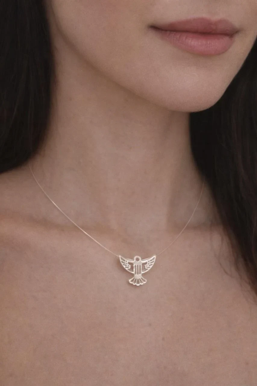Colar delicado com pingente em formato de Espírito Santo, símbolo de fé, proteção e luz. A peça possui corrente em nylon transparente, trazendo um efeito leve e minimalista que valoriza ainda mais o pingente.