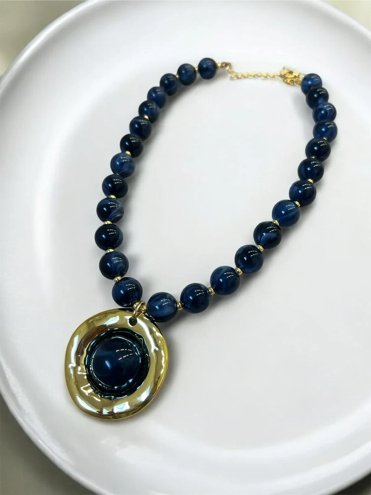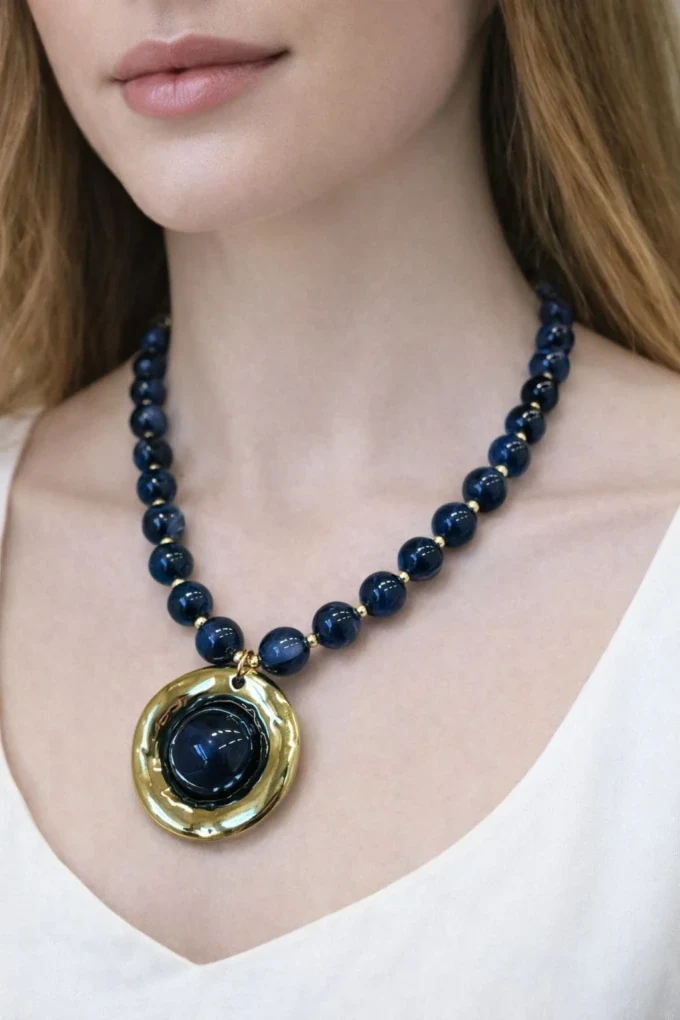 Colar sofisticado com contas e pingente em formato de medalha com acabamento dourado. Uma peça elegante e marcante que valoriza qualquer look, do casual ao mais sofisticado.