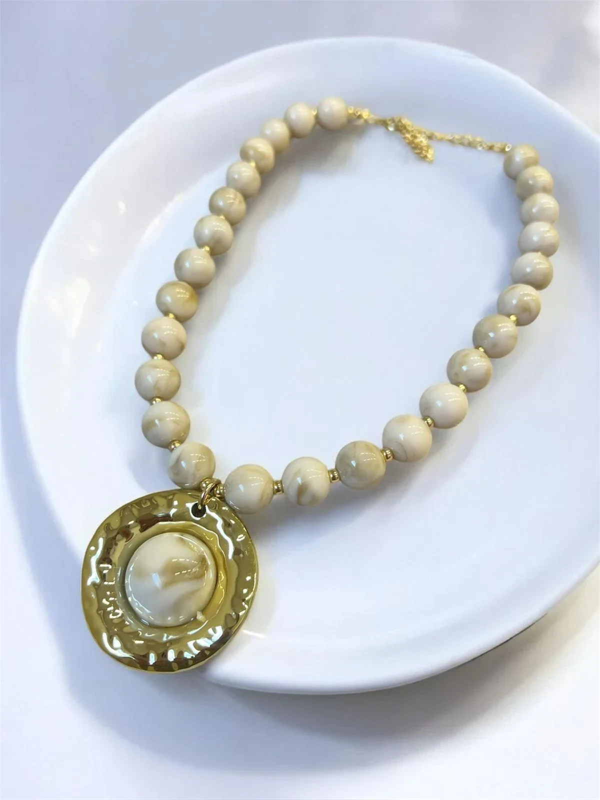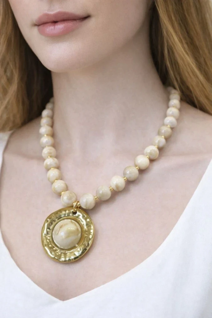 Colar sofisticado com contas e pingente em formato de medalha com acabamento dourado. Uma peça elegante e marcante que valoriza qualquer look, do casual ao mais sofisticado.