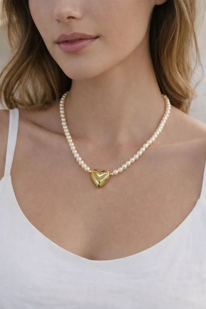 Colar delicado com pequenas pérolas e pingente de coração dourado, trazendo um visual romântico e elegante. Uma peça clássica e versátil, perfeita para compor looks do dia a dia ou ocasiões especiais.