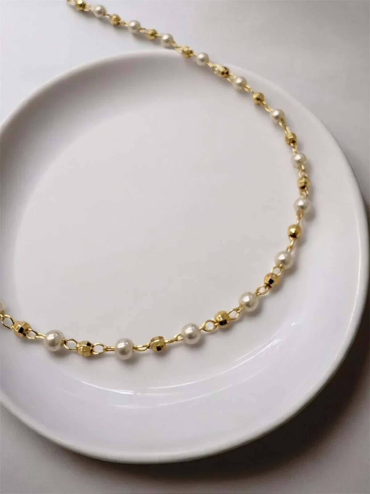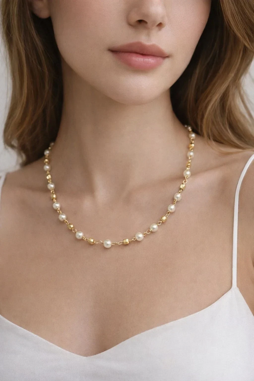 Colar de bijuteria com pérolas e detalhes dourados, delicado e fácil de combinar, perfeito para dar um toque elegante ao look.