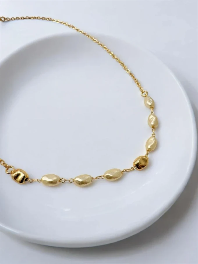 Colar de bijuteria com corrente dourada e pérolas alongadas, delicado e elegante. Um acessório versátil que combina facilmente com diferentes looks.