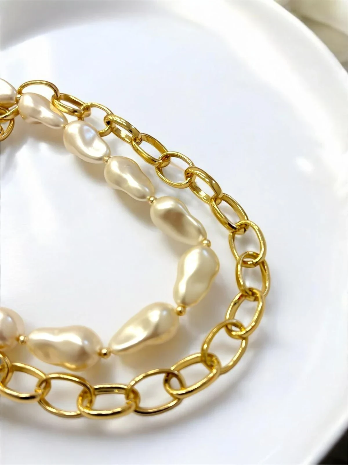 Colar elegante que combina corrente dourada com pérolas de formato orgânico, trazendo um visual sofisticado e moderno. Uma peça versátil que valoriza qualquer look, do casual ao mais elegante.