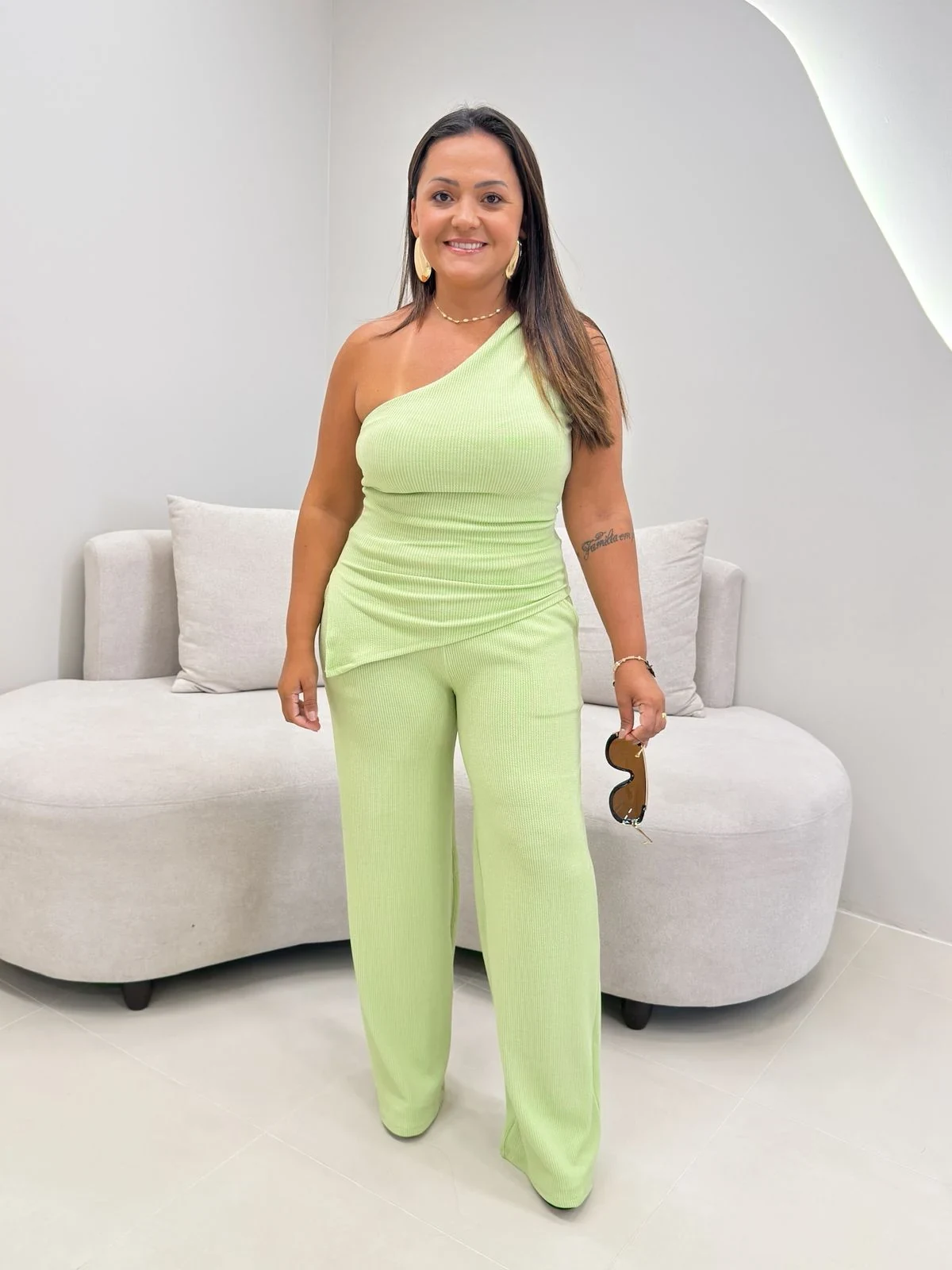 Com design assimétrico de um ombro só, ele valoriza o corpo de forma elegante e moderna. A blusa tem caimento impecável e a calça com modelagem reta alonga a silhueta, deixando o look sofisticado e confortável ao mesmo tempo.