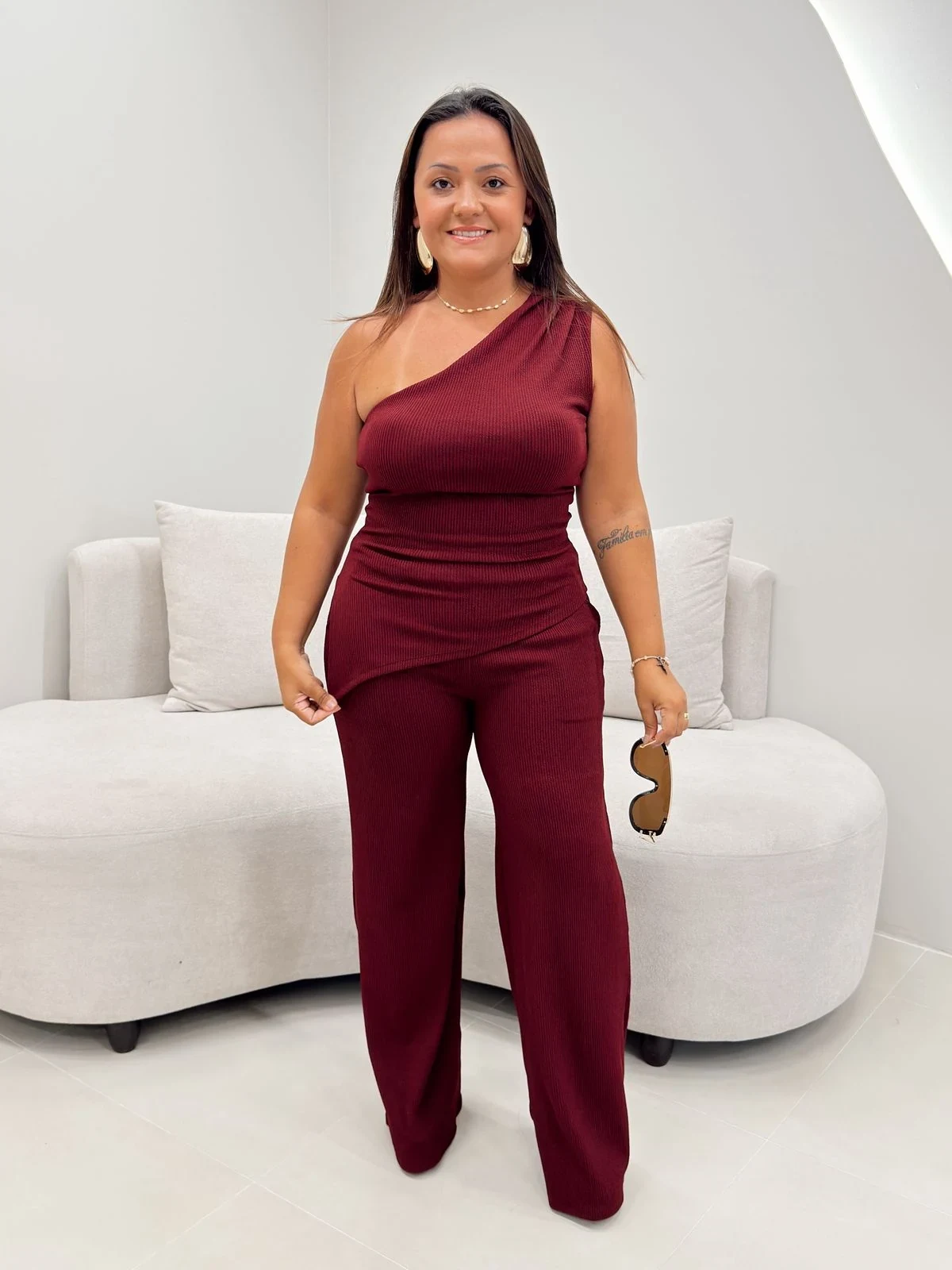 Com design assimétrico de um ombro só, ele valoriza o corpo de forma elegante e moderna. A blusa tem caimento impecável e a calça com modelagem reta alonga a silhueta, deixando o look sofisticado e confortável ao mesmo tempo.