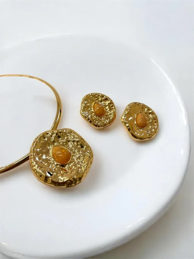 Conjunto sofisticado composto por colar rígido dourado e brinco com design texturizado e detalhe em pedra central. Uma peça elegante e marcante, perfeita para valorizar o look com estilo e personalidade.