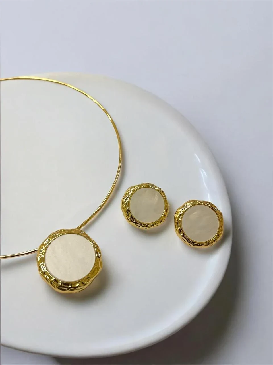 Conjunto sofisticado composto por colar rígido dourado e brinco com detalhe central em pérola. Uma peça elegante e minimalista, perfeita para valorizar o look com um toque clássico e refinado.