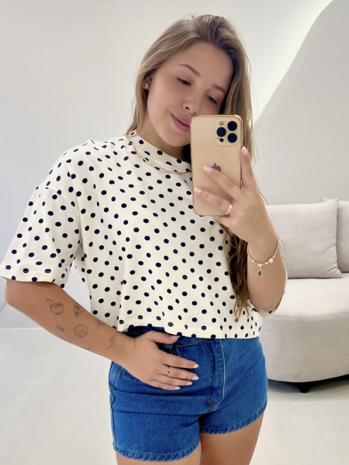 Cropped Maísa – Branco c/ Bolinhas azul