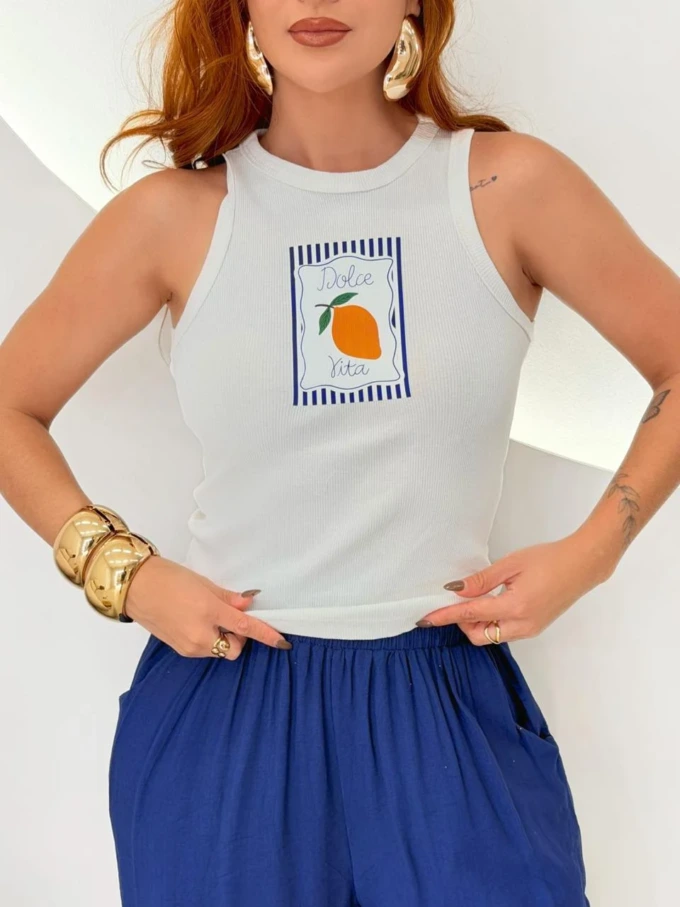Regata em malha canelada com excelente elasticidade e conforto. Modelo moderno e versátil, ideal para compor looks casuais ou estilosos no dia a dia. As estampas exclusivas trazem personalidade à peça, deixando o visual leve e cheio de estilo.