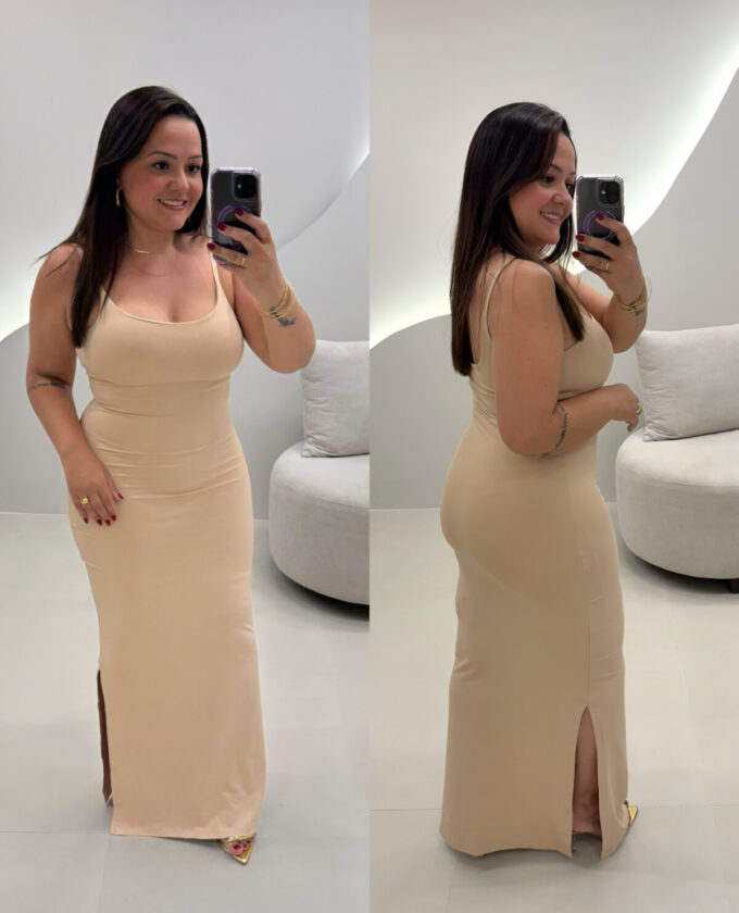 Medidas: Busto 68cm, Cintura 76cm, Quadril 90cm, Comprimento 126cm (veste 36 ao 44);